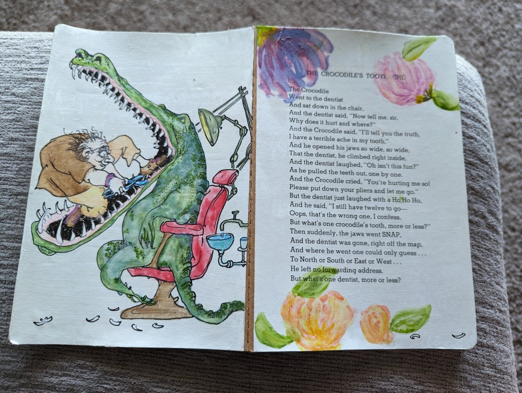 This was a fun one! I was walking through the Haymarket in Lincoln, NE and stumbled upon a woman who took book pages and made journals from them. I immediately gravitated to this one with a cover from the Shel Silverstein poem ‘The Crocodile’s Toothache’. I have been reading his books since childhood and now I have a journal that makes me smile and feel connected to his poem in a whole new way! Back to what I said earlier about the type of paper making a difference, this one was not the most cooperative. It began to pull and pill from the water but I don’t mind. It gives it character. What do you think? Do you have a favorite poem by Shel Silverstein?